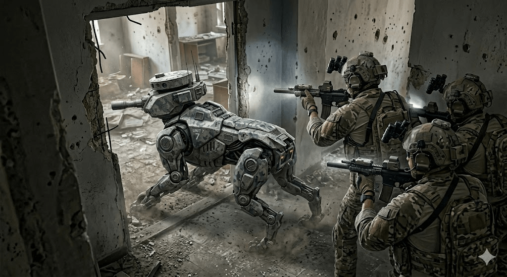 The model, as sources have described it, envisions small direct-action teams — think four to six operators — augmented by two to four teleoperated UGVs of varying form factors. Bipedal platforms offer the ability to navigate human-built environments: stairs, doorways, vehicles. Quadrupedal platforms offer speed, stability over rough terrain, and payload capacity for sensor packages or direct-fire systems.