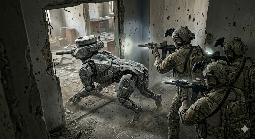 The model, as sources have described it, envisions small direct-action teams — think four to six operators — augmented by two to four teleoperated UGVs of varying form factors. Bipedal platforms offer the ability to navigate human-built environments: stairs, doorways, vehicles. Quadrupedal platforms offer speed, stability over rough terrain, and payload capacity for sensor packages or direct-fire systems.